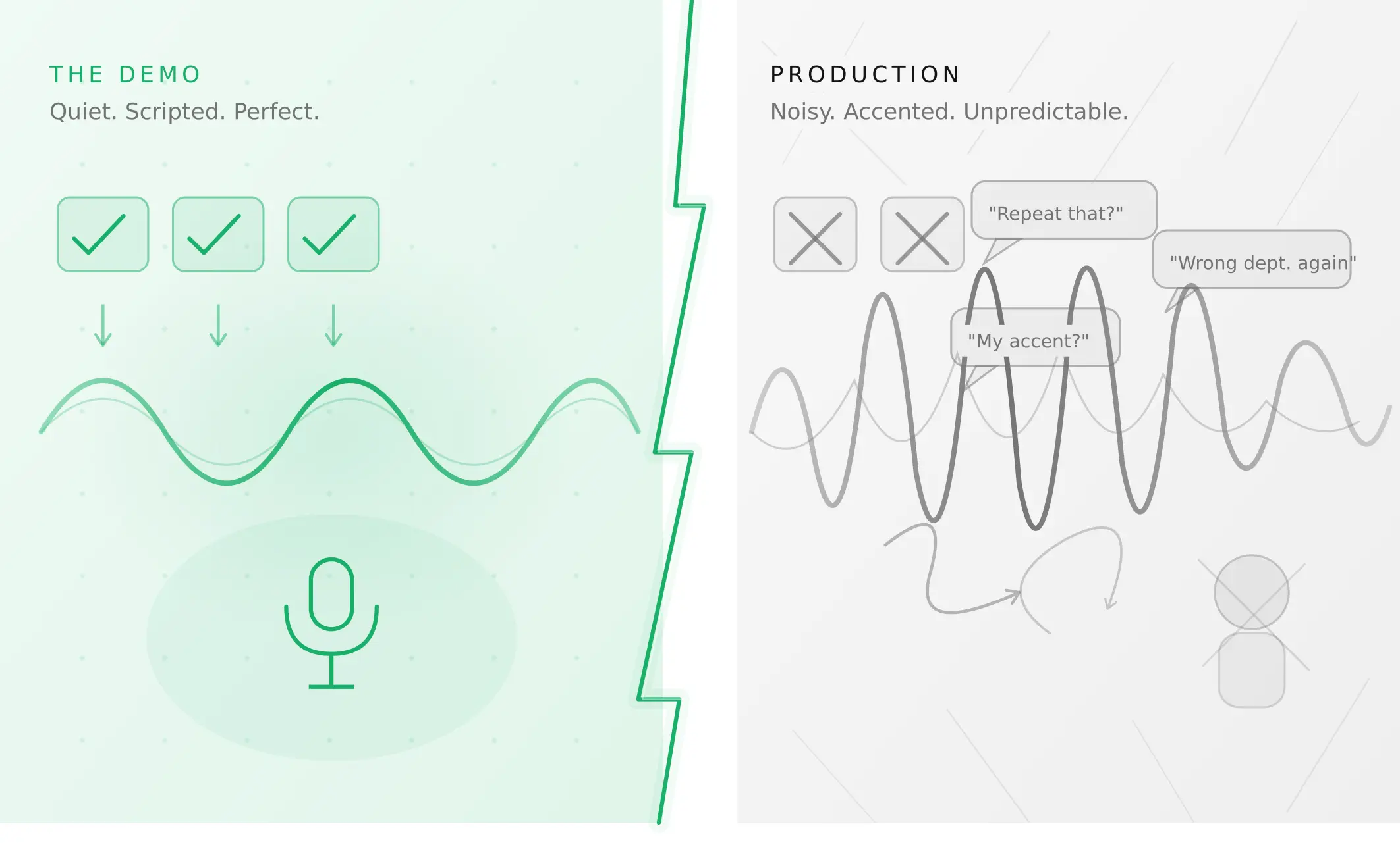 AI voice agents that ace demos still break in production. Learn the 5 root causes, how to test for each, and what production readiness actually means.