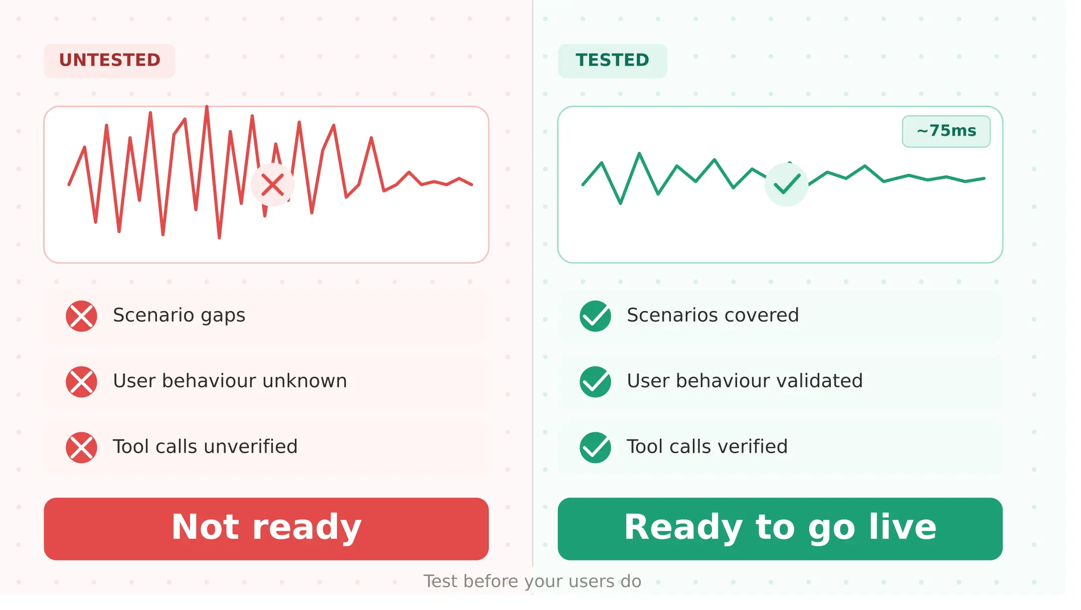 ElevenLabs Flash delivers ~75ms inference time and 3,000+ voices — the strongest combination of voice quality and speed available for production voice agents in 2026. Realising those advantages in production requires systematically testing five things before launch: scenario coverage, user behaviour under real acoustic conditions, tool call and handover correctness, concurrent call capacity, and voice quality regression after every change. Every failure mode covered here is catchable before it reaches users.