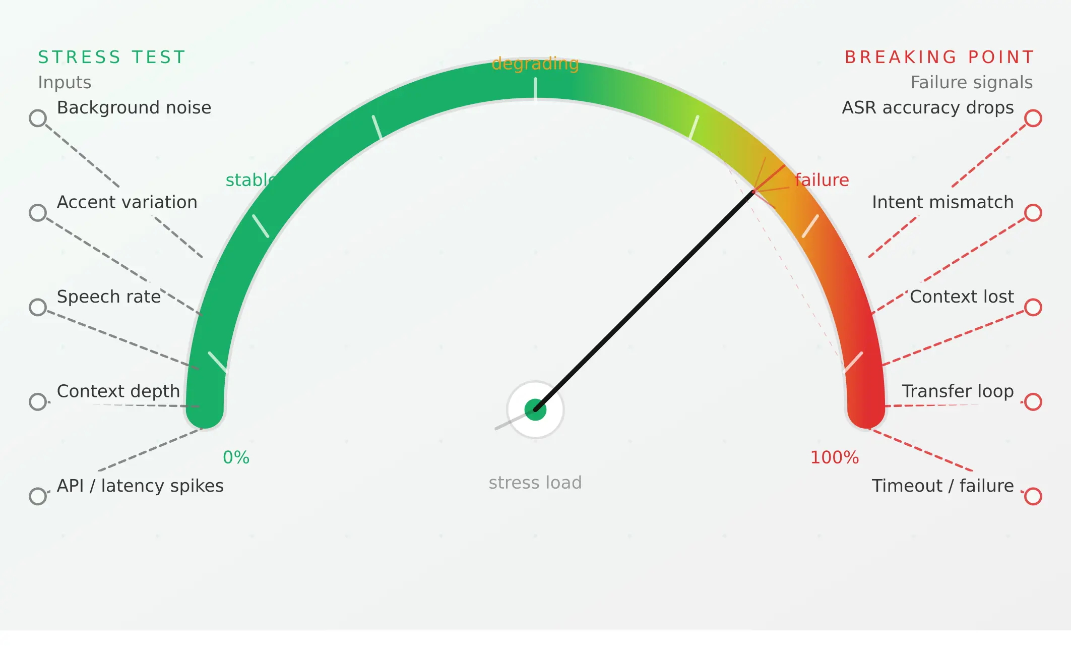 2. User behaviour stress test — Run every scenario across at minimum three caller profiles: clean audio baseline, 65 dB noise, and one accent variant representative of your user base. Track barge-in recovery rate and task completion rate per profile. Apply the full stress-testing methodology to find acoustic and conversational breaking points.